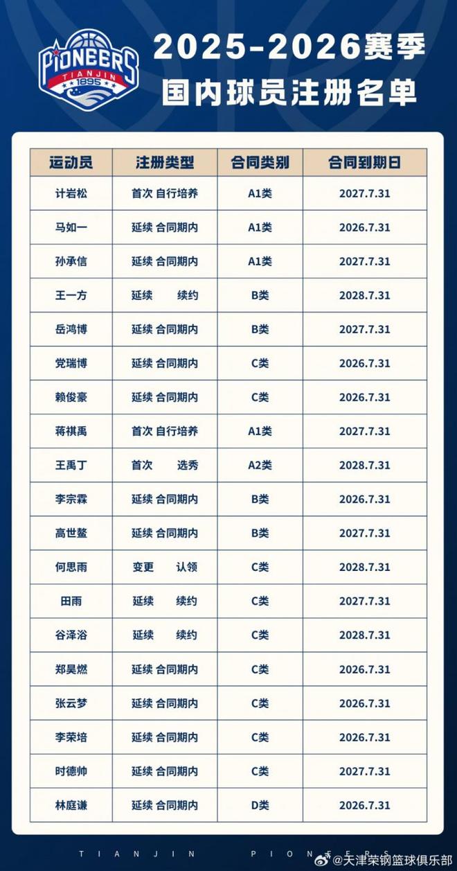 9月2日訊 今天,天津男籃官方宣布了新賽季國內球員的注冊信息。