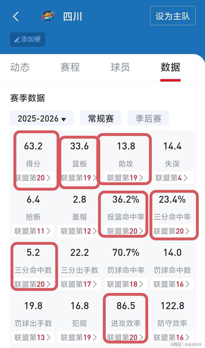 截止目前,四川隊在新賽季5戰皆墨。先后輸給廣州、青島、山東、南京和北京。5場比賽輸了136分,場均輸27.2分。同時,球隊多項技術統計,排名聯盟倒數1-2名。