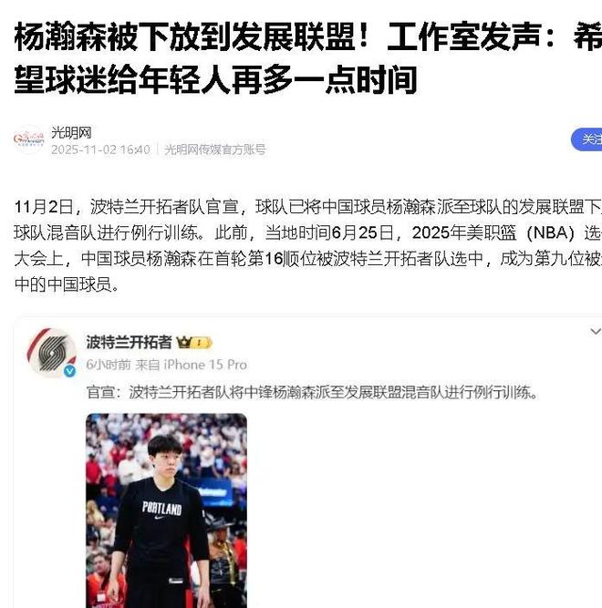 更讓球迷焦慮的是,11月2日、3 日開拓者對陣太陽、爵士的比賽,楊瀚森接連被下放到發展聯盟附屬球隊“撕裂之城混音隊”。