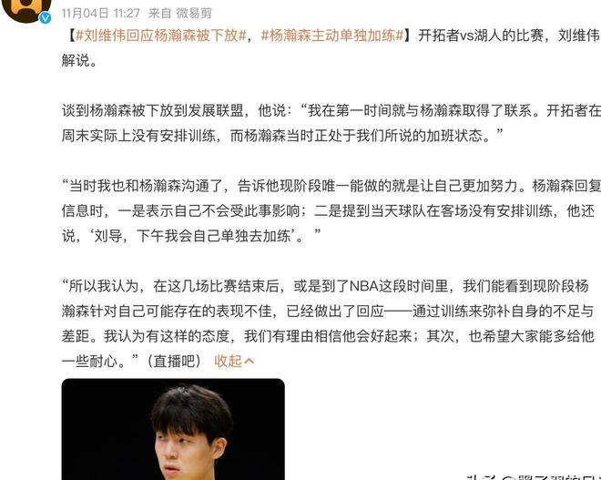 11月5日劉維偉首次公開談論了楊瀚森近期的情況,一番話讓球迷徹底放下心來。